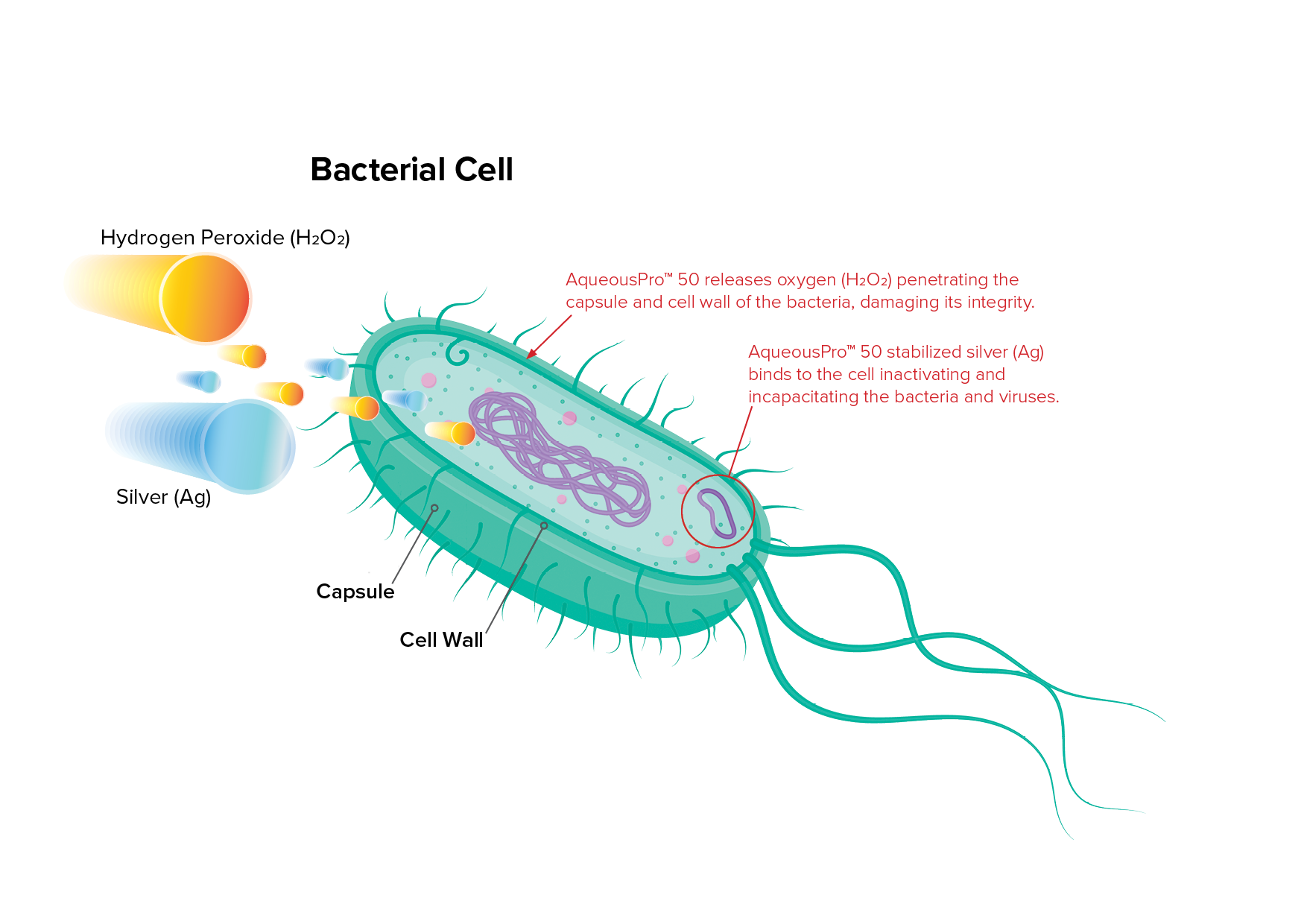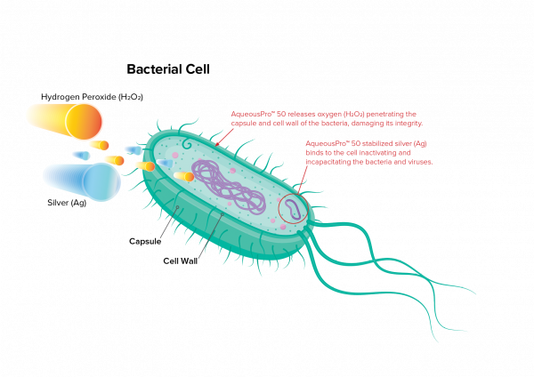 Hydrogen Peroxide (H2O2) has been used as an antiseptic to kill bacteria since the 1920’s. H2O2 destroys the cell walls of the bacteria in a process called Oxidation. The bacteria is then neutralised becoming harmless in the process.